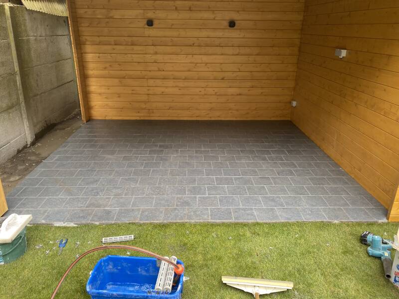ook voor onder tuinhuizen kunnen wij tegelen of andere bestrating plaatsen.